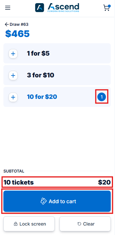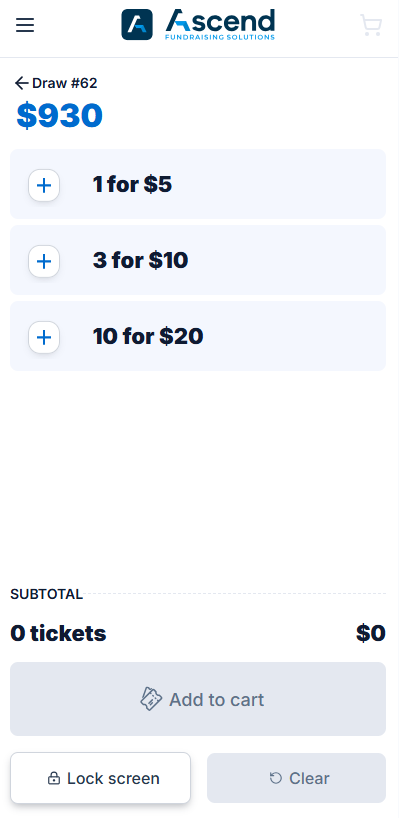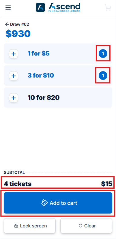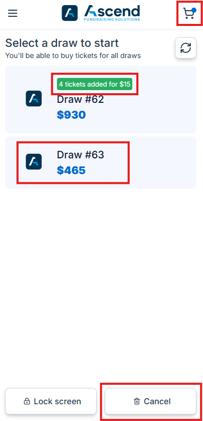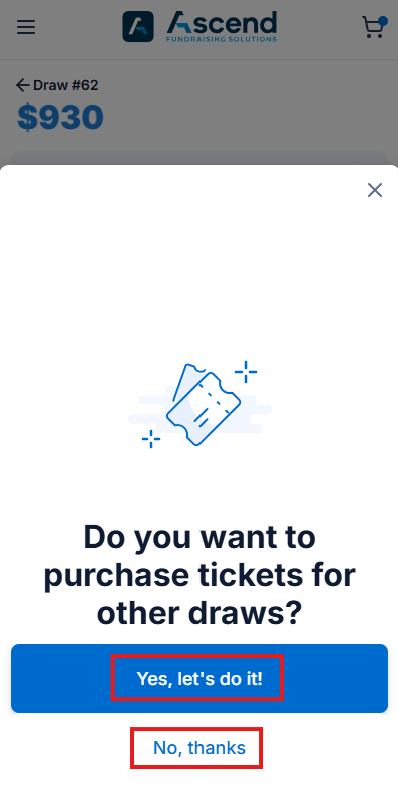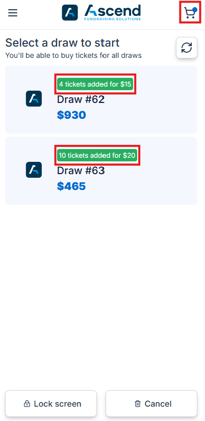 - After selecting tickets for one of the draws and clicking Add to cart, the device will prompt the seller if they want to purchase tickets for other draws.