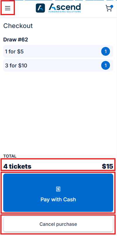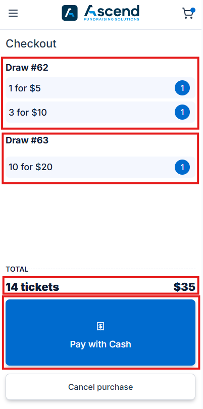 - If on the Checkout screen, the customer changes their mind and wishes to purchase tickets for other draws, the seller can click the