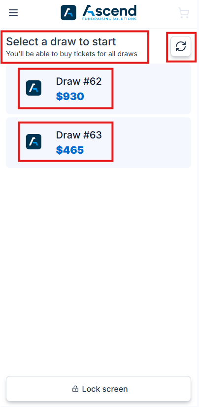 - Upon opening the home screen, the seller will notice all the active draws available to purchase tickets.