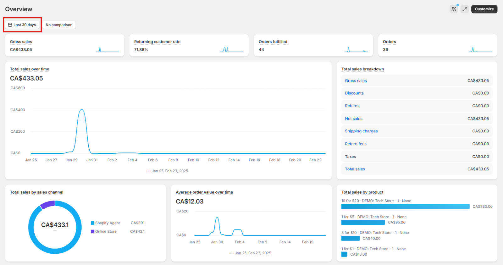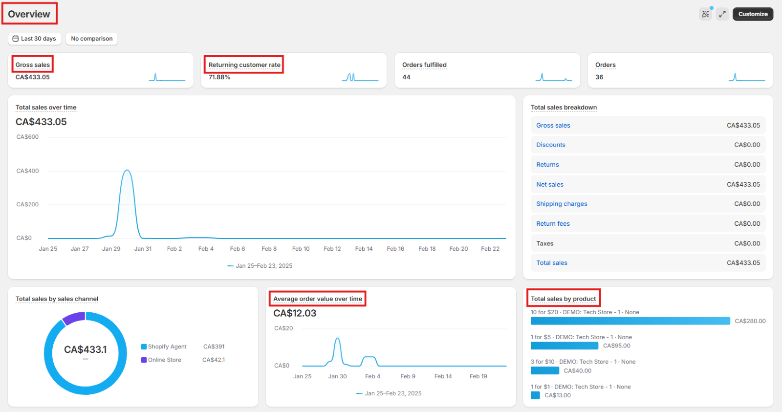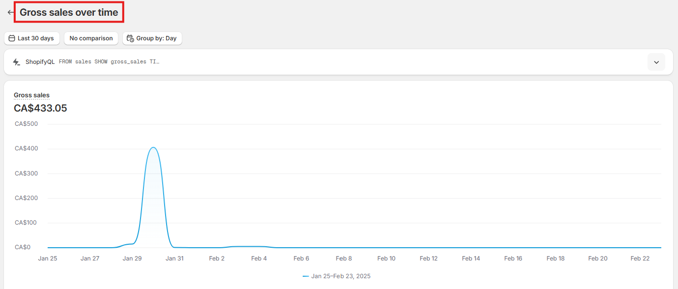 Shopify provides various out-of-the-box metrics and visualizations in this dashboard such as Gross sales, Returning customer rate, Average order value over time, Total Sales by product, etc.