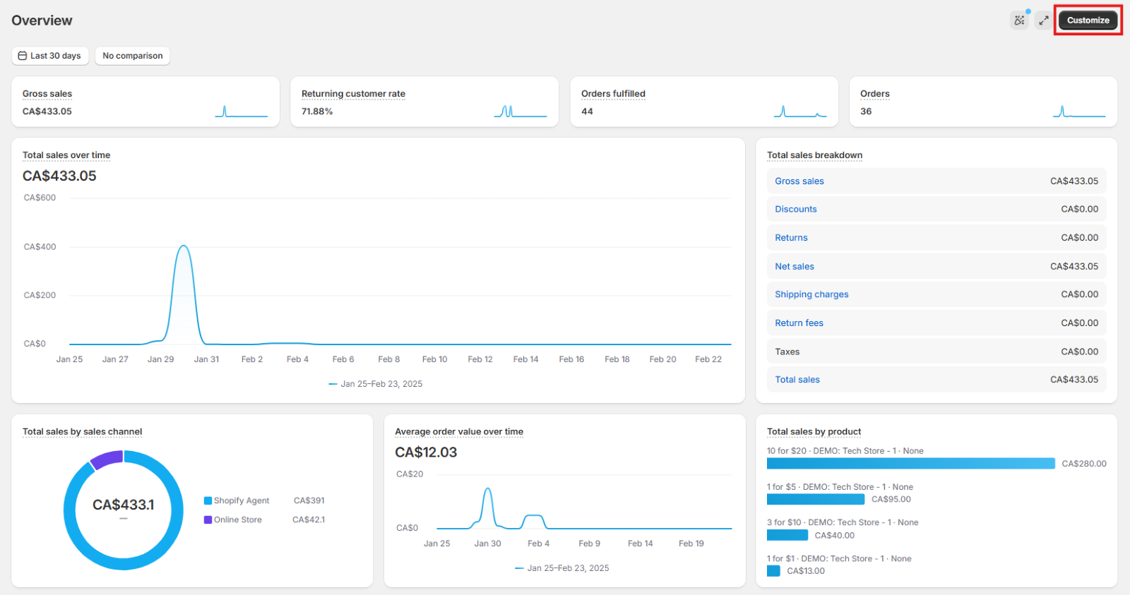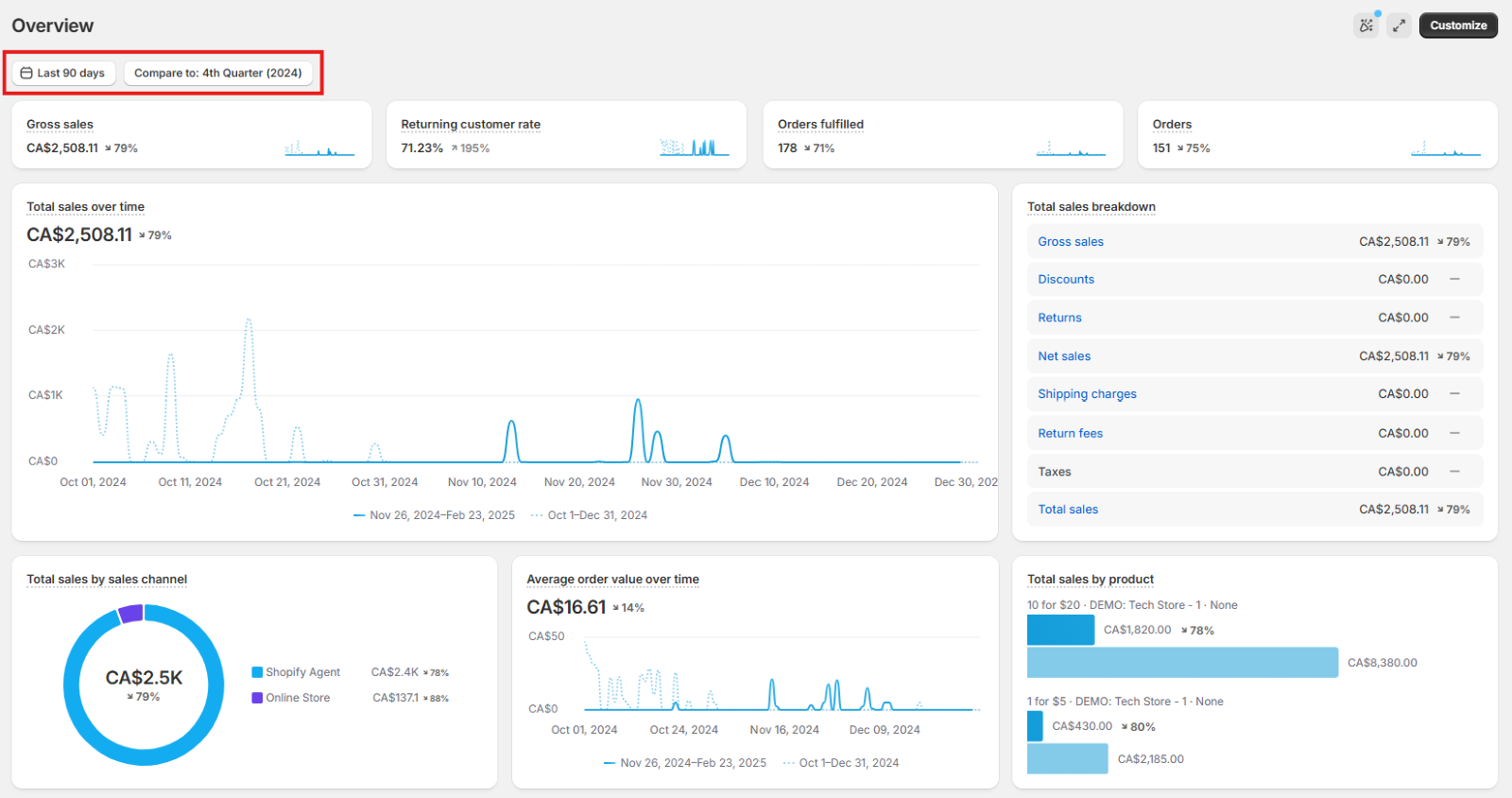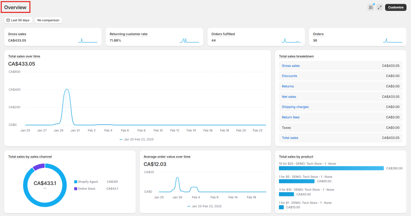 Shopify provides various out-of-the-box metrics and visualizations in this dashboard such as Gross sales, Returning customer rate, Average order value over time, Total Sales by product, etc.