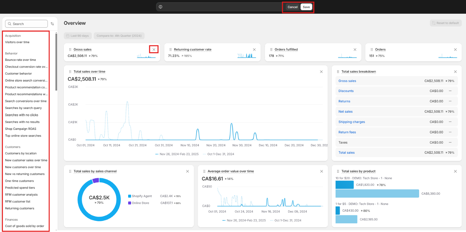 Users can add or remove visualizations and choose from the various out-of-the-box options provided by Shopify. After making changes, users need to click on Save to update the dashboard or Cancel to discard changes.
