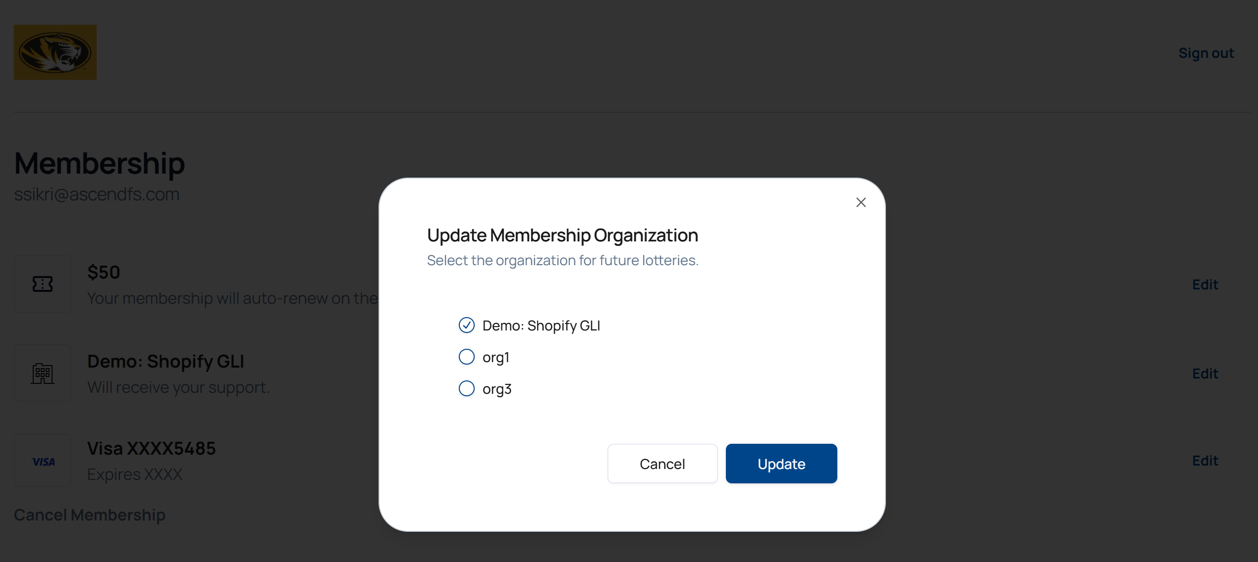 2. On the Update Membership Organization popup, user can select from the available options the organization they wish to support. User must select Update to save a change, or Cancel return to the main account page.