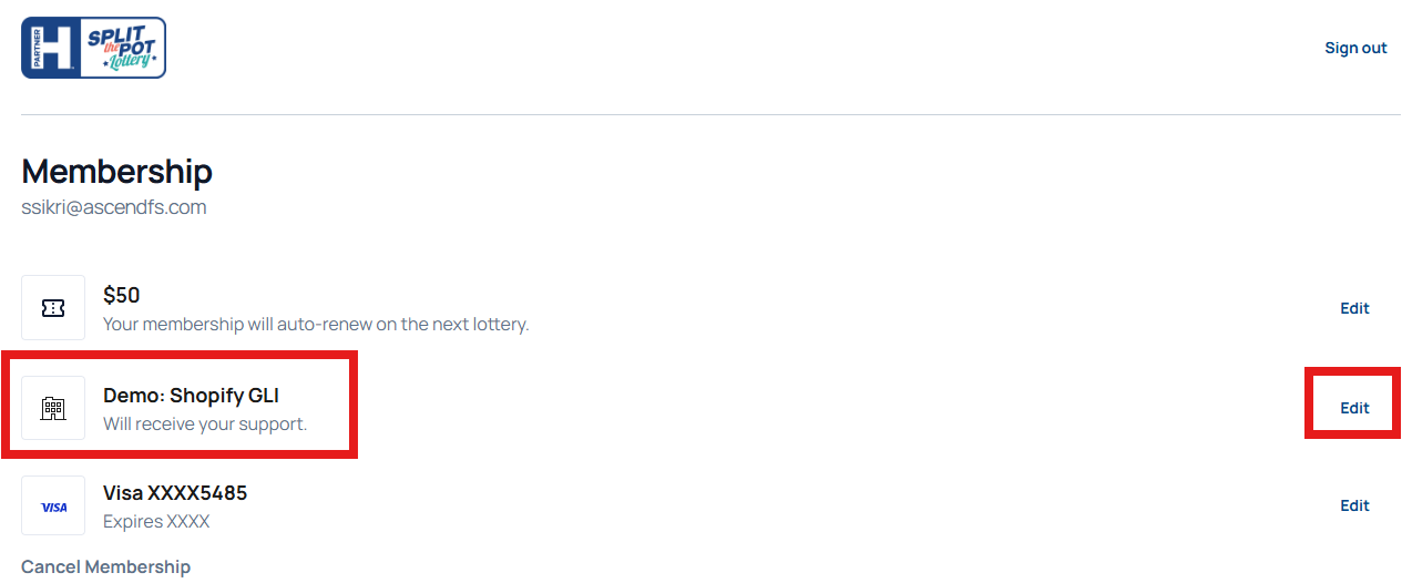 1. User can select the Edit button to view and change organization/partner that their purchase supports (if applicable).
