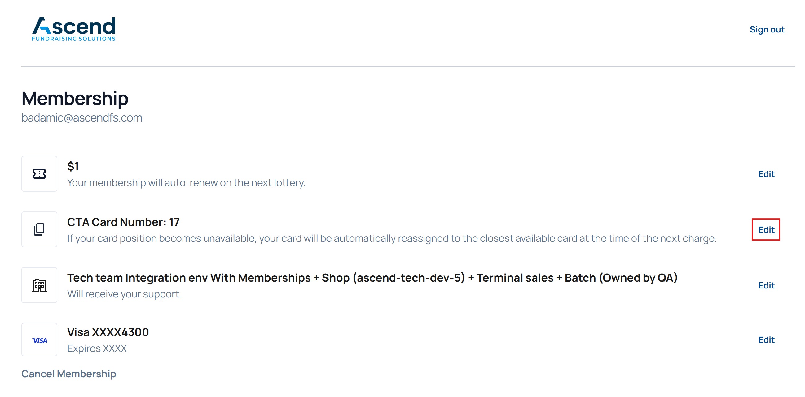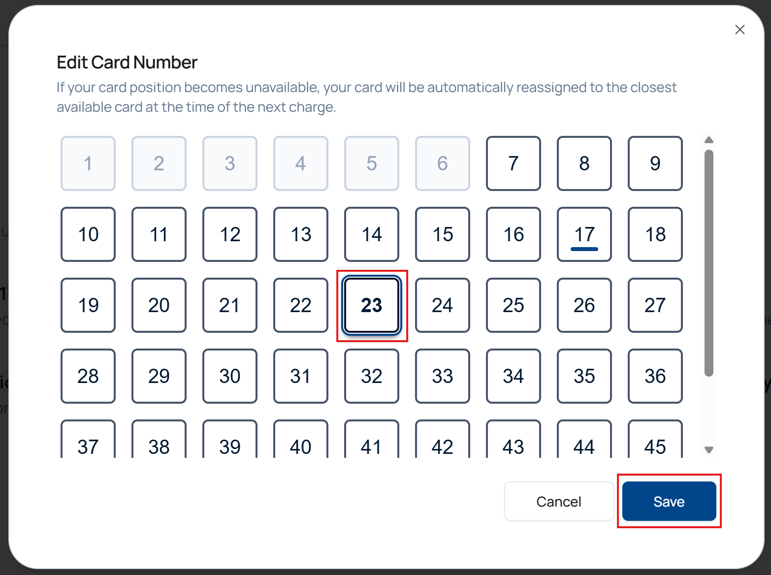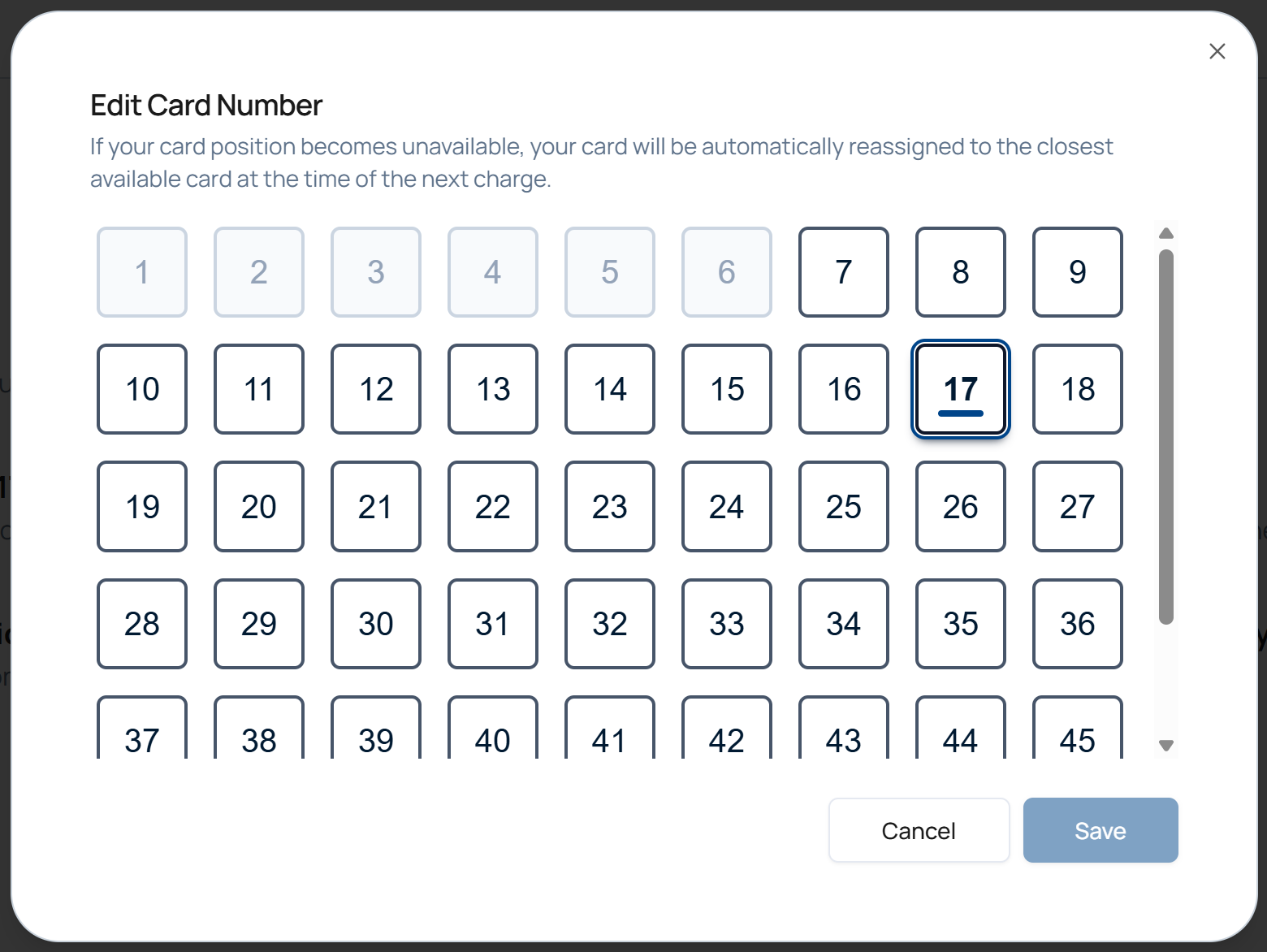 2. On the Edit Card Number popup, user can select from the available options the card they wish to be assigned for future lotteries. User must select Save to record a change or Cancel to return to the main account page.