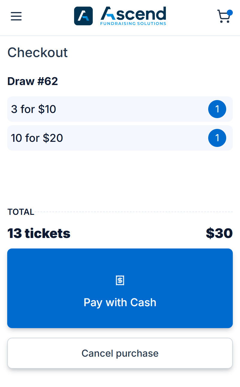 Once tickets have been chosen and the Add to Cart button has been selected the seller will be presented with the checkout. From here a reminder of the selected tickets is shown as is the total amount the customer wishes to purchase.