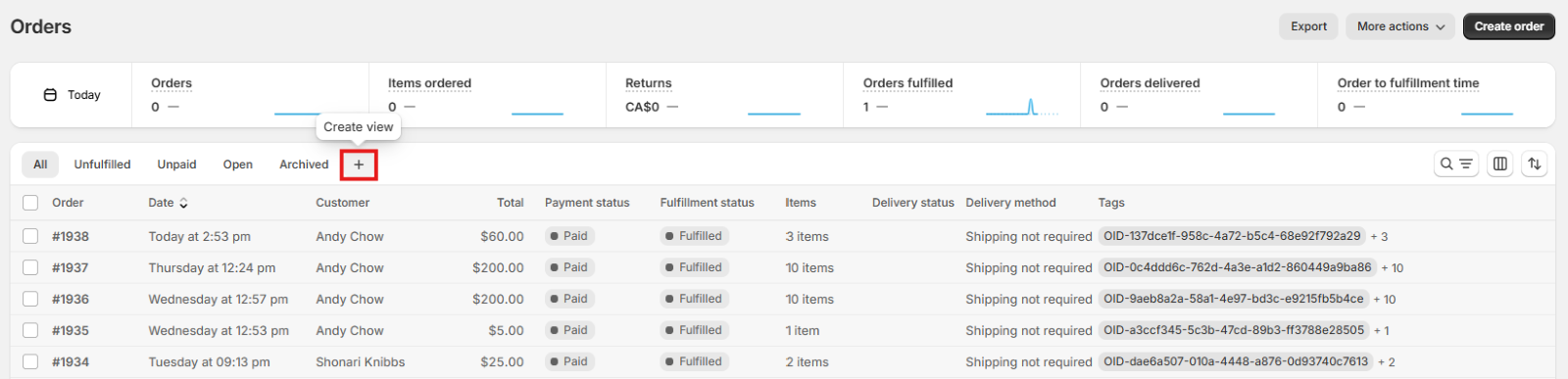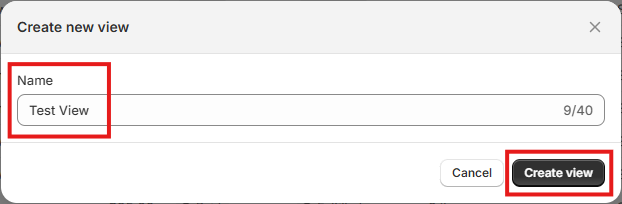 On the Orders page, users can click on the “+” icon to Create a view. Users will be prompted to enter a name for the view and then click Create View.